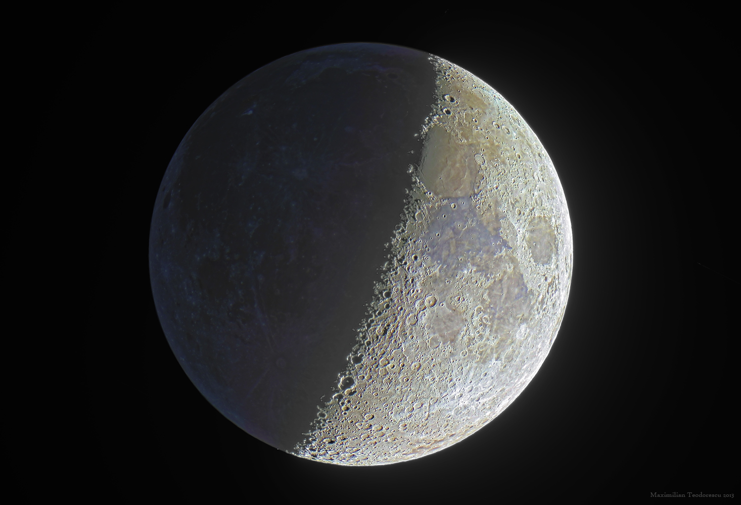 Si varianta color, cu supra-saturarea culorilor originale pentru a releva atat culoarea albastruie a luminii cenusii (datorate reflectarii luminii Pamantului) cat si culorile diferitelor minerale de la suprafata lunara: