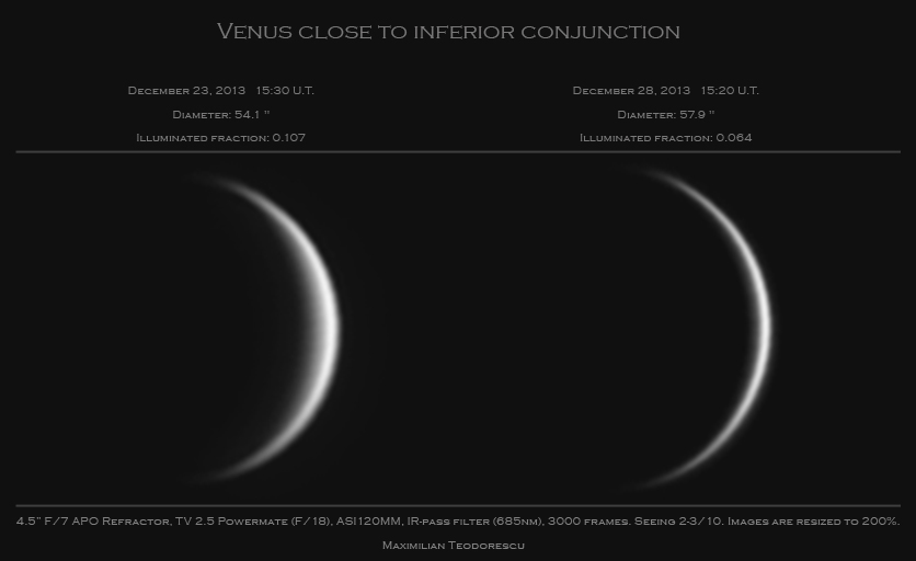 De aceasta data am mai incercat si o achizitie putin diferita, avand ca scop surprinderea zonei intunecate a planetei, un fel de “lumina cenusie” a lui Venus (de la acelasi terment folosit pentru a descrie lumina Pamantului reflectata de catre Luna). Aceasta lumina se datoreaza caldurii emise de planeta, observabila in mod normal la lungimi de unda de peste 1micron (1000nm). Cum eu nu am un filtru care sa lase doar lumina de infrarosu de la 1000nm in sus, am achizitionat cadrele cu ce am avut la indemana, si anume filtrul IR-pass de 685nm (ce lasa sa treaca lumina de la 685nm in sus, deci un domeniu mult mai larg). Din cele 30 de cadre a cate 5 secunde fiecare, realizate cu refractorul de 115mm la F/18 si camera ASI120MM a iesit imaginea urmatoare, ce prezinta secera planetei achizitionata cu alte setari, suprapusa peste imaginea pentru “zona intunecata”. In stanga sus fata de secera se observa destul de slab continuitatea discului planetei.