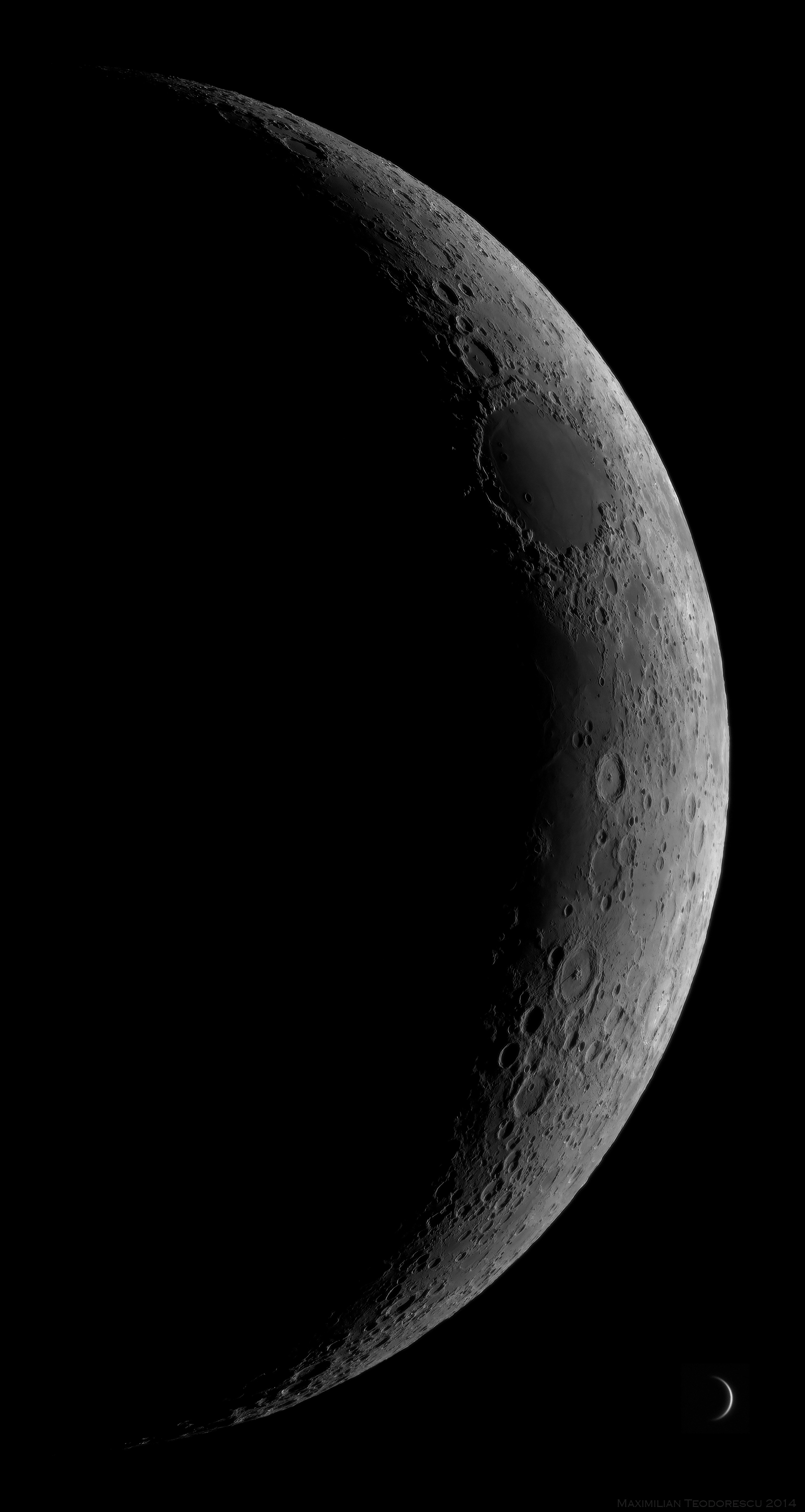 Echipament: Refractor TS APO 115mm F/7 si Canon 550D in focar pentru imaginea de fundal (media a 60 cadre), si acelasi refractor dar la F/18 cu Powermate 2.5x si camera ASI120MM cu filtru IR-pass (stack a 2000 cadre in seeing 3/10) pentru imaginea de detaliu.