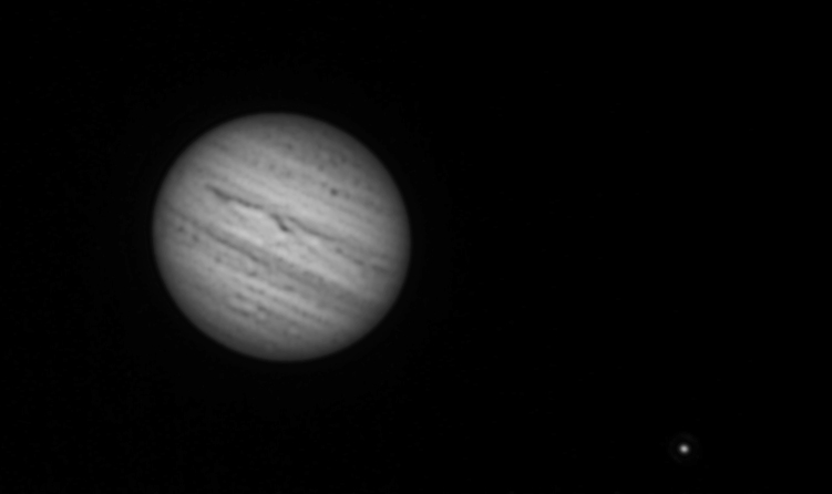 Imaginea cu planeta Jupiter este realizata in putinele momente de seeing bun, la F/36, cu camera ASI120MM si filtru IR-pass, fiind un stack a 900 de cadre: