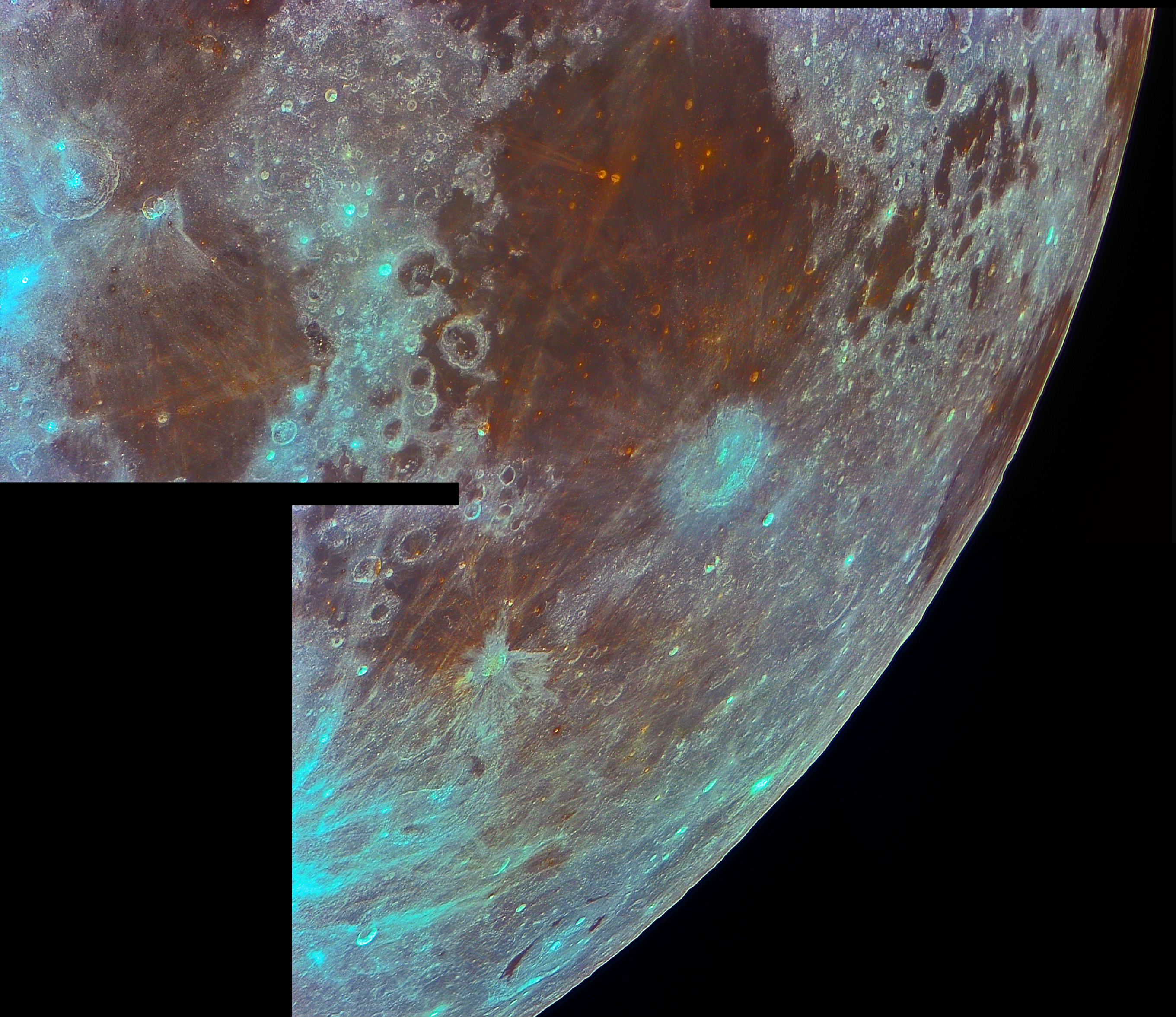 Now the ray pattern of this large crater is much more evident, as is the light-blue ring around it, especially towards the South (down). Notice the butterfly wings of the crater in the lower part of the image, just above Petavius; interesting also are the different colors of it’s rays, the ones inside Mare Fecunditatis (to the North-West) being of a reddish color. There are some interesting red-ringed craters, most noticeable Al-Marrakushi and Acosta to the West and North of Langrenus, respectively. It seems that the impacts excavated iron-rich materials (if the reddish hues in my images are indeed a hint of the lunar minerals) from bellow, since their reddish color overlaps the rays of Langrenus.