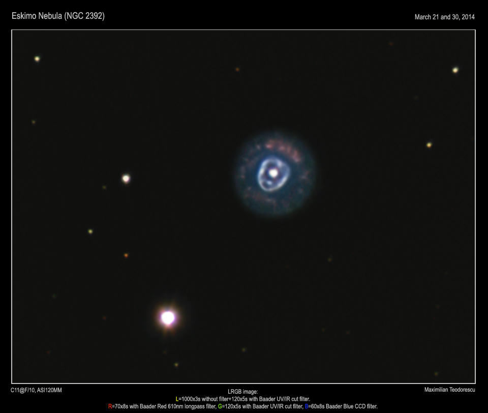Another deep-sky object. This time is the Eskimo Nebula (NGC 2392) in Gemini, a planetary nebula that also goes by the name of “the Clown face”. The resemblance is evident in most images.
