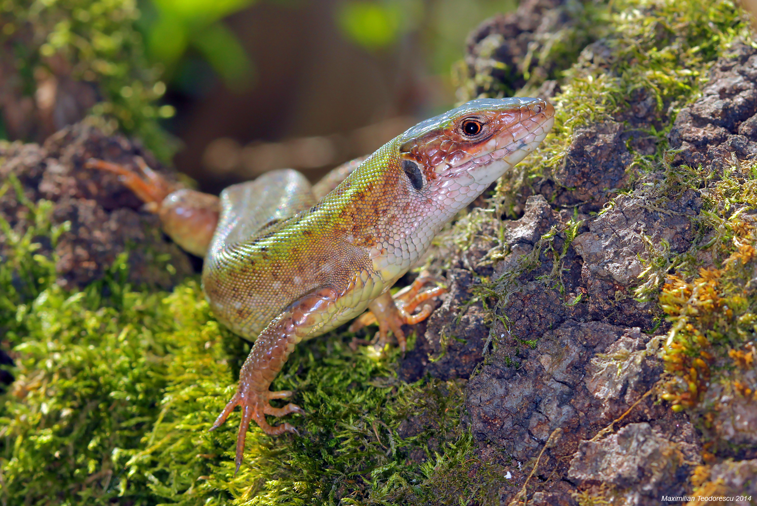 Incep cu un exemplar femela de Guster (Lacerta viridis) incalzindu-se in plin vaz, fara prea multa frica de fotografii curiosi ce ii urmareau fiecare miscare: