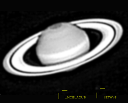 After processing the image sets, I’ve found that I’ve also captured two of Saturn’s satellites, barely visible in the image below: