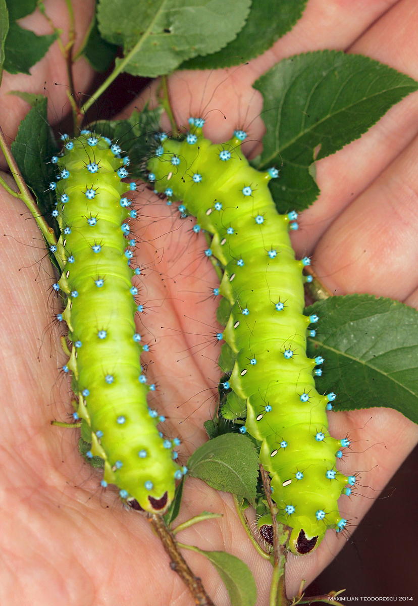 Si revin cu informatii legate de evolutia omizilor de Saturnia pyri: cele trei larve au acum dimensiuni…astronomice. Cea mai mare a ajuns deja la 10cm (!) lungime, urmatoarele avand 8 si respectiv 7 cm. O fotografie avand ca etalon chiar mana ce le da sa manance: