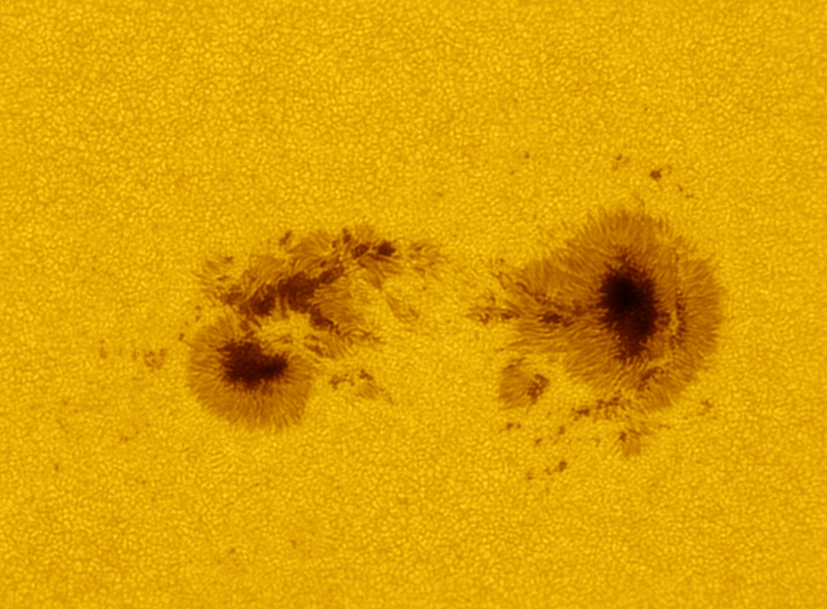 The two largest sunspot groups on the Sun this week looked quite similar on July 7, a day before my previous post. This time I’ve used my 115mm F/7 APO Refractor at F/22 and F/35, the ASI120MM camera with Baader Green CCD filter. Seeing 5/10.