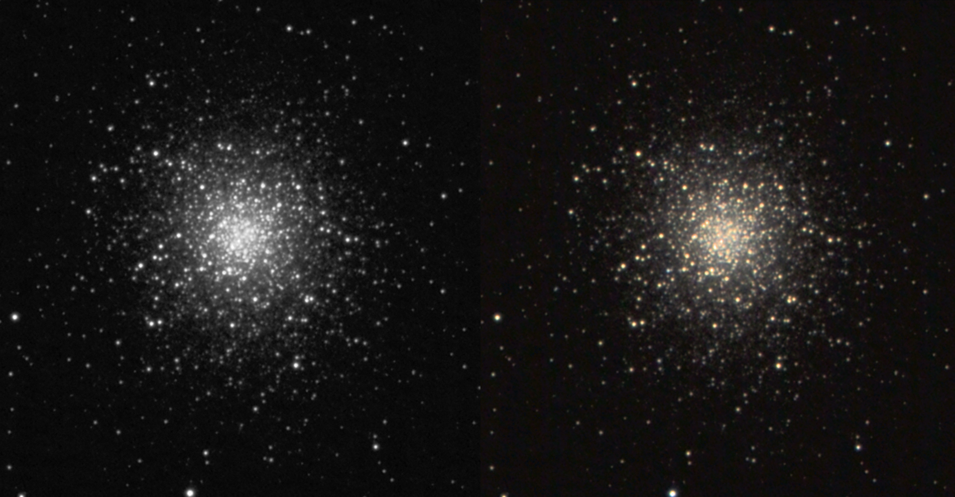 This is why I’ve only used my very small Refractor, a TS APO 65Q with 420mm focal length, the ASI120MM mono camera and Baader RGB CCD filters for colors and a UV/IR cut Baader filter for the Luminance channel. They were all mounted onto the EQ6 SW equatorial mount with the “standard” three-star alignment procedure. That was one of the reasons why I’ve acquired 20 seconds frames instead of longer exposures (the full “technical” details would also include: Gain setting: 50, Gamma setting: 90. Only one dark frame was acquired during the entire session). The sky at my location was clear but the limiting visual magnitude next to M 13 was around +5.2, so rather poor conditions for serious astrophotography.