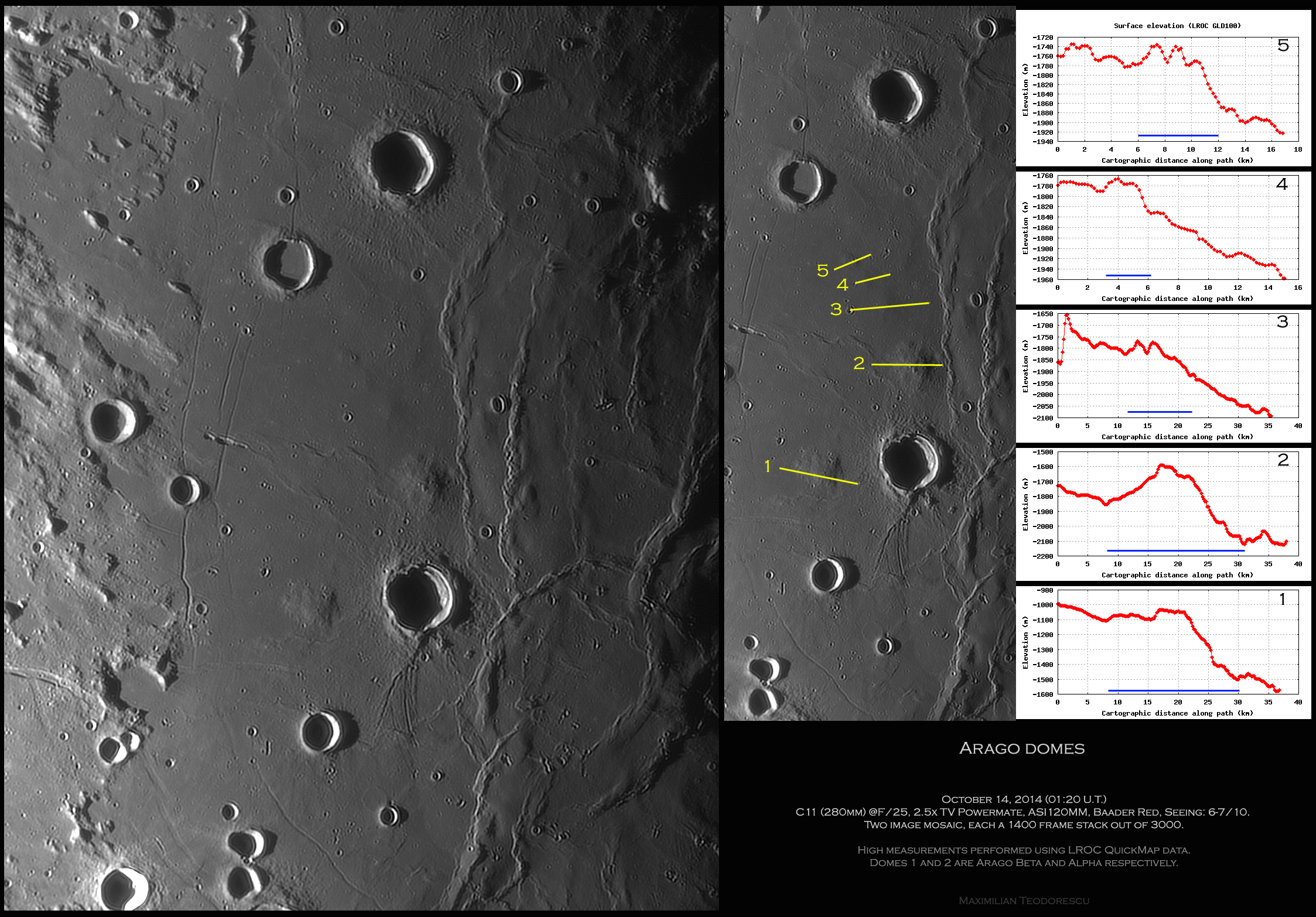 Using the LROC (Lunar Reconnaissance Orbiter Camera) QuickMap measuring tool I’ve measured the height of some of the domes present in the above images. The yellow lines show my selected measuring paths while the blue lines in the graphs show the approximate diameter of the domes.