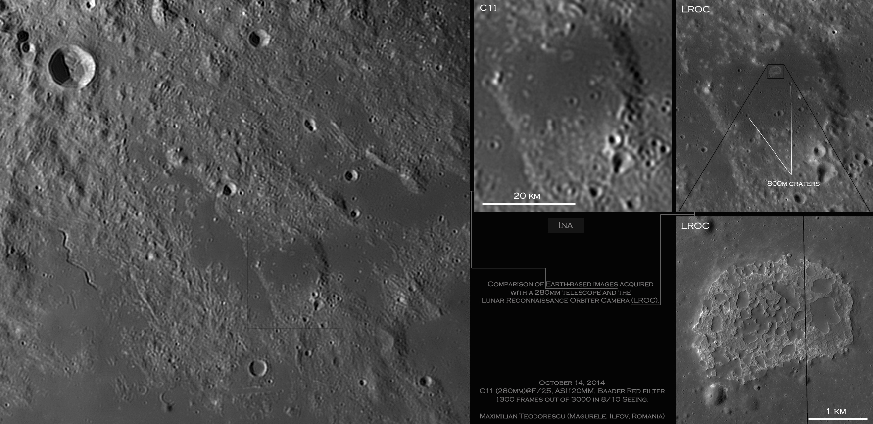 And since Ina is a rather small feature but of a big importance in our understanding of the Moon’s history, I had to compare my images of this area (in terms of resolution) with the “master” of all lunar images, the Lunar Reconnaissance Orbiter. My smallest details imaged with the 280mm scope are a few 800m-wide craters marked in the LRO detailed images from the mosaic below.