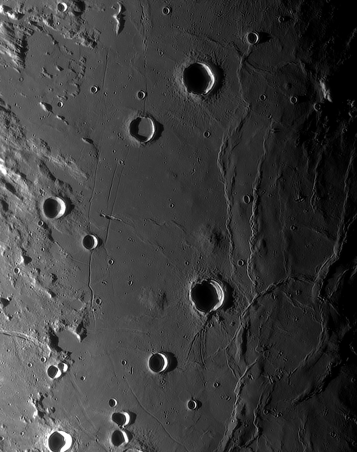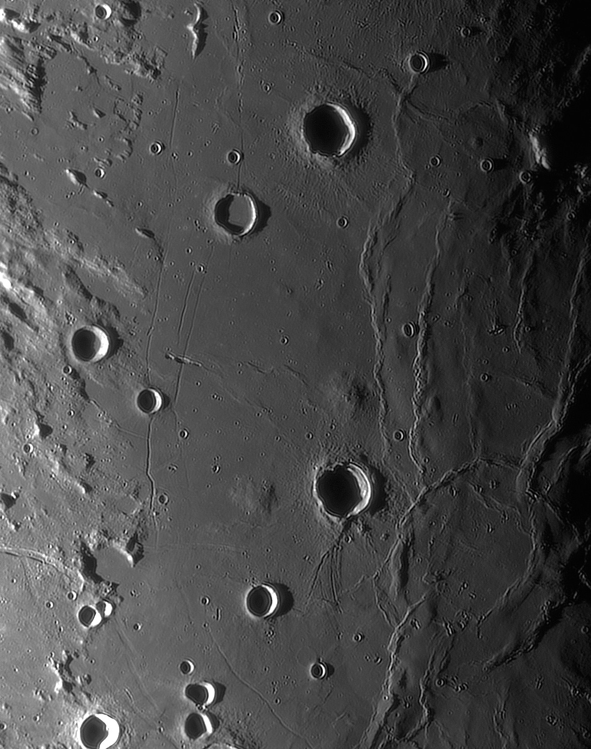 An interesting volcanic area is presented below, showing the Hyginus (left) and Ariadaeus rimae. The Triesnecker Rimae is visible just below Hyginus, and also the Sosigenes Rimae can be seen in the right part of the image, together with a very interesting volcanic feature crossing it.