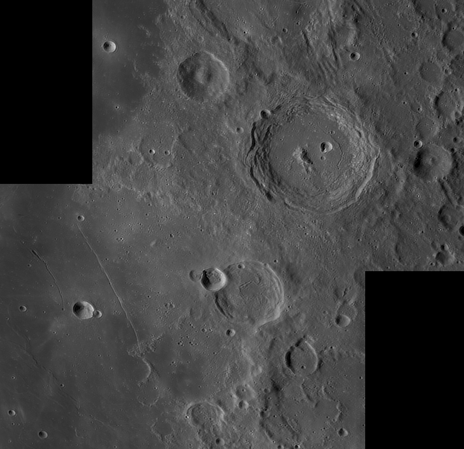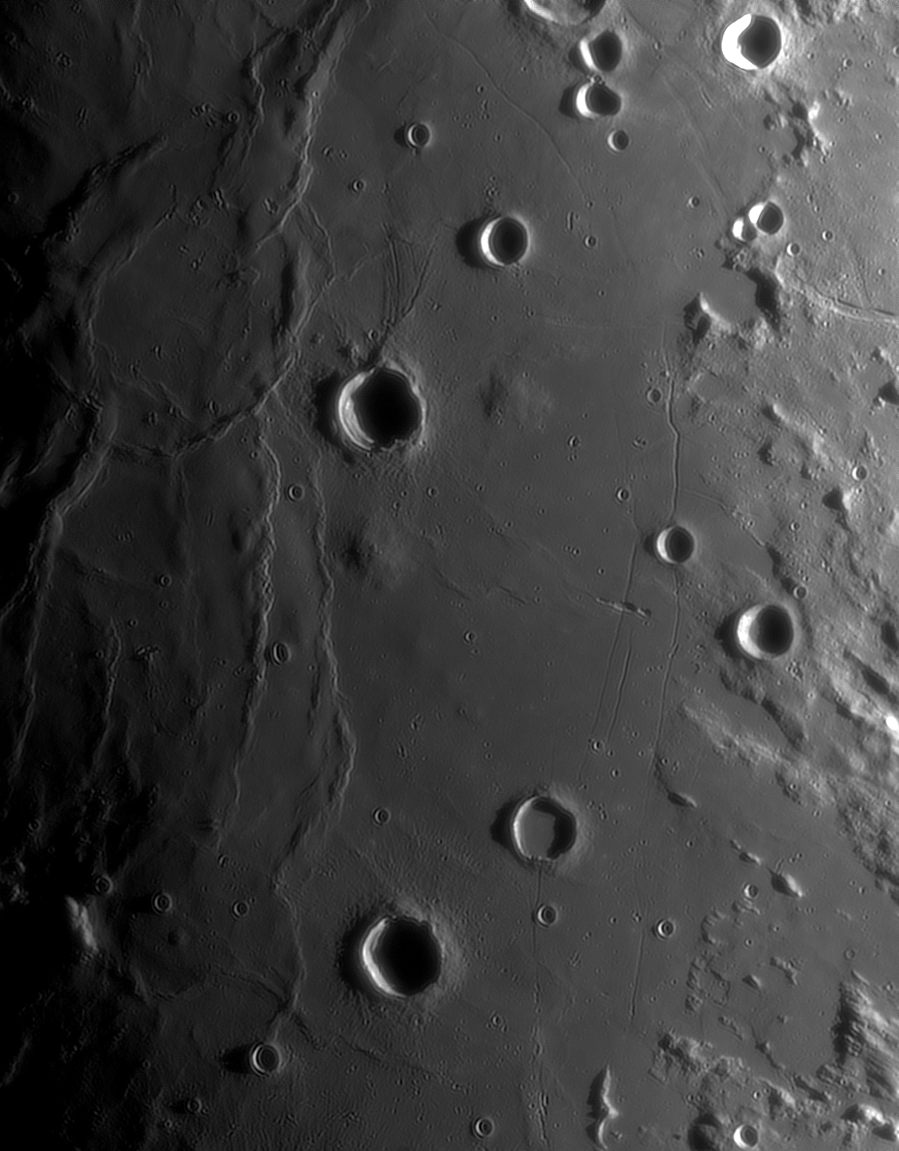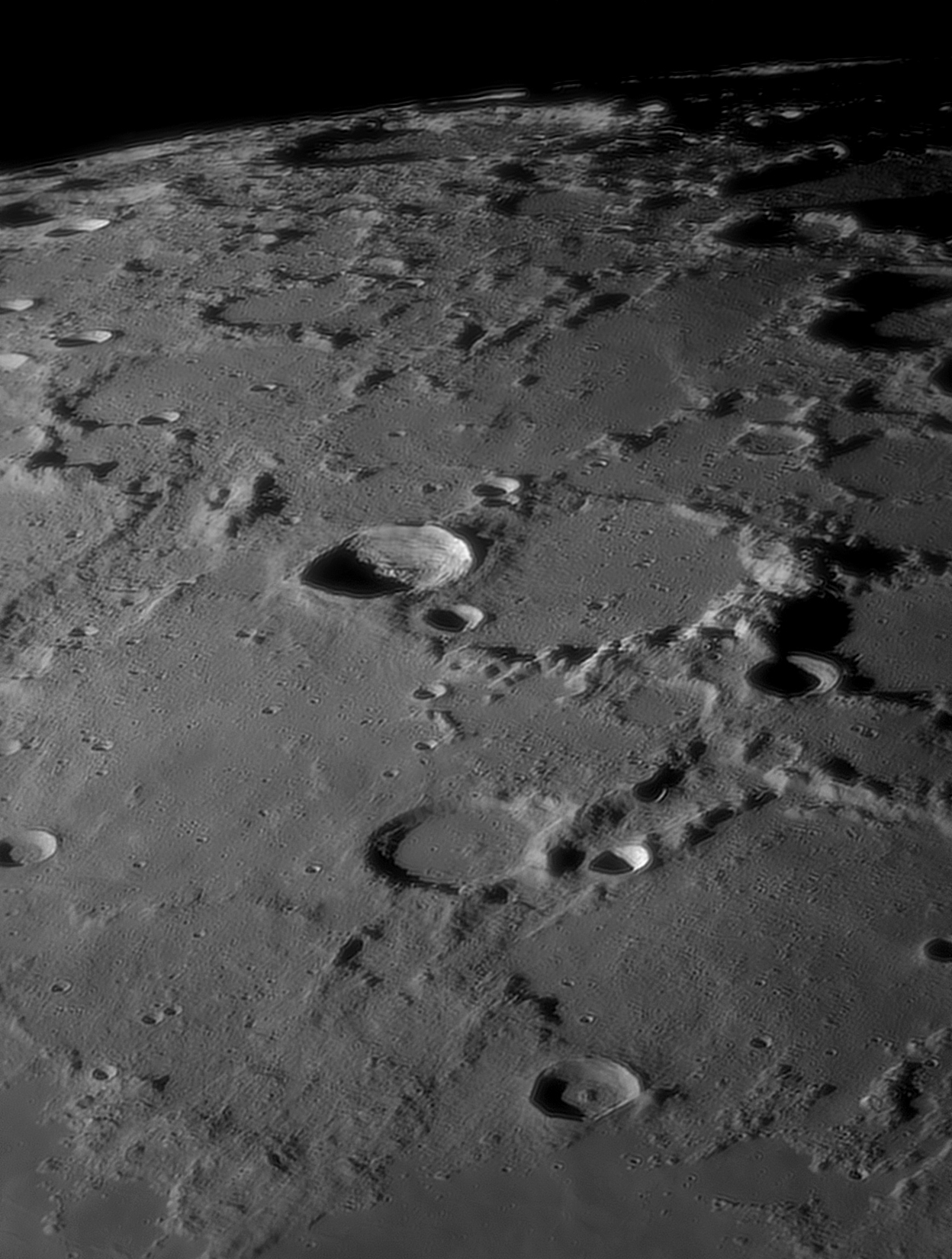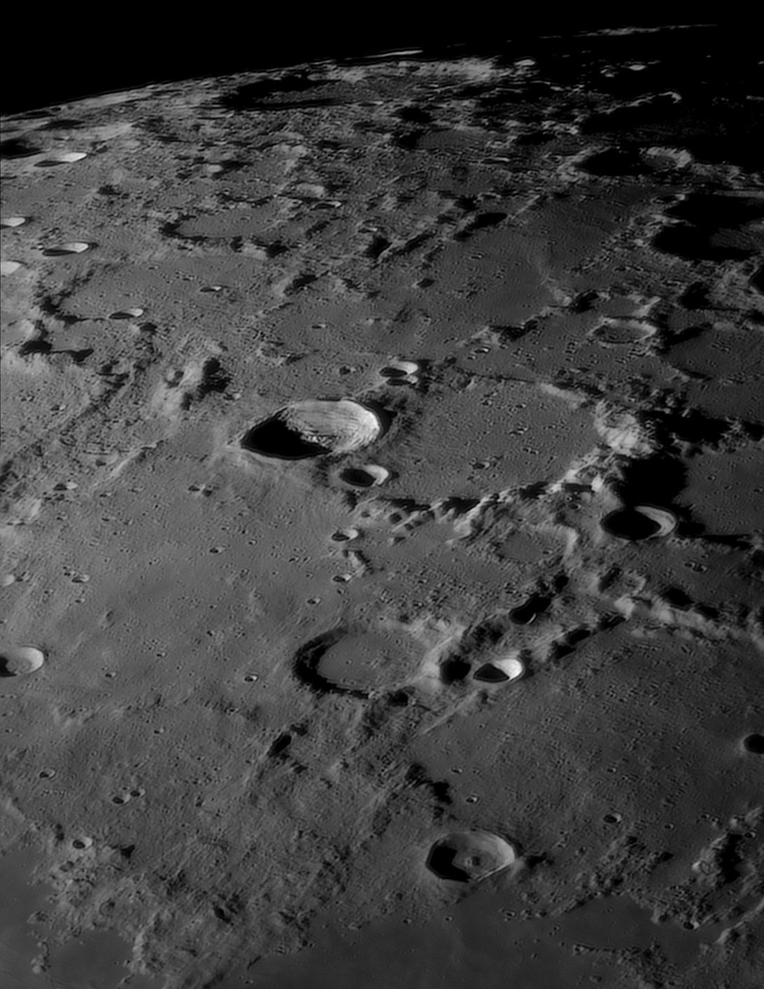 Another “nice” image shows the lunar rougher terrain around crater Abulfeda (around 60km in diameter), just below the center of the image. An interesting feature near-by is the chain of craters that go away from Abulfeda towards the upper left corner of the image, properly named Catena Abulfeda. Another very interesting feature is the deformed-floor crater in the upper part of the image, named Abenezra; it looks like the meteorite that form the crater just didn’t stop spinning after it impacted the lunar surface (just a funny observation of course).