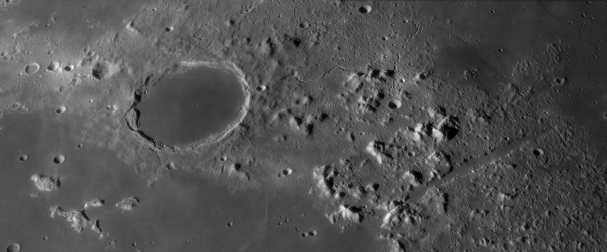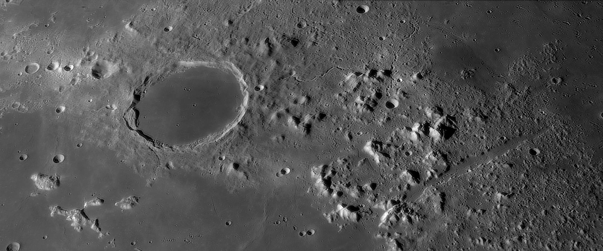 The Moon has many areas where signs of volcanic activity are present, and perhaps none is more famous than the feature named Ina. The image below shows the entire imaged area which also includes Rima Hadley (upper part of the image) and part of the Appenninus mountains. The landing spot of the Apollo 15 mission was near Rima Hadley, so this is an historic area for the Moon but also for the humans.