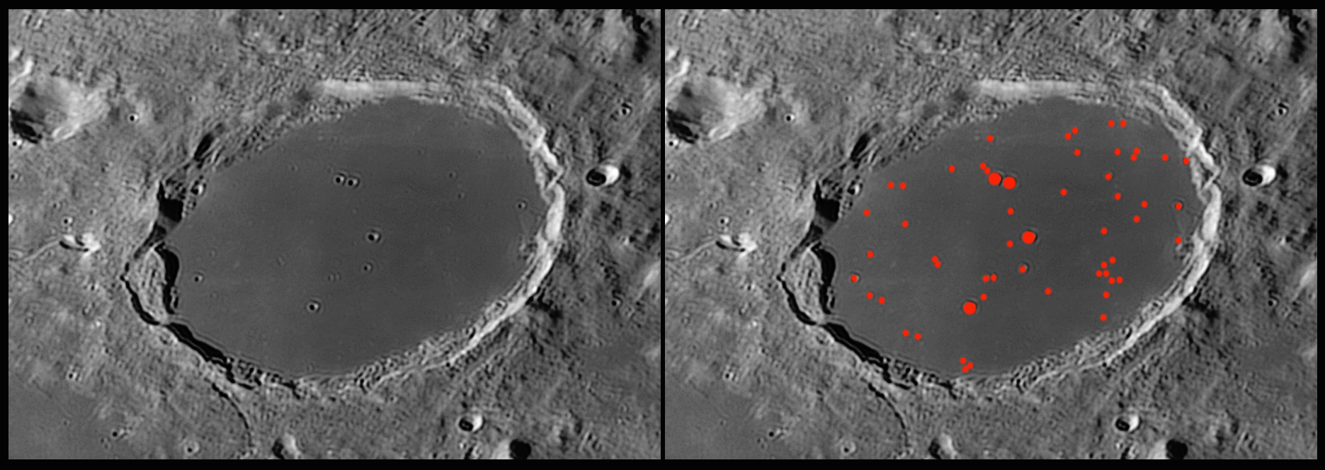 And the resolution test image, a re-processed image from the above one, showing only Plato and around 56 marked small craters onto it’s floor. I’ve only marked those craters which show the tiniest amount of inner shadow, so many other bright spots are ignored, despite being also the signs of small craters.