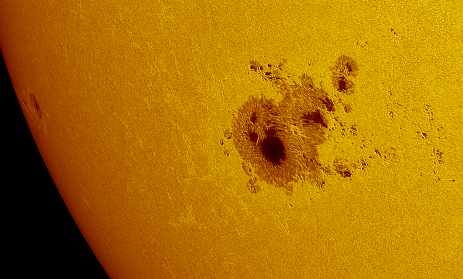 The final image showing perhaps better the relative size of the sunspot on the solar disc. The image was shot in the focal planet of the refractor (800mm).