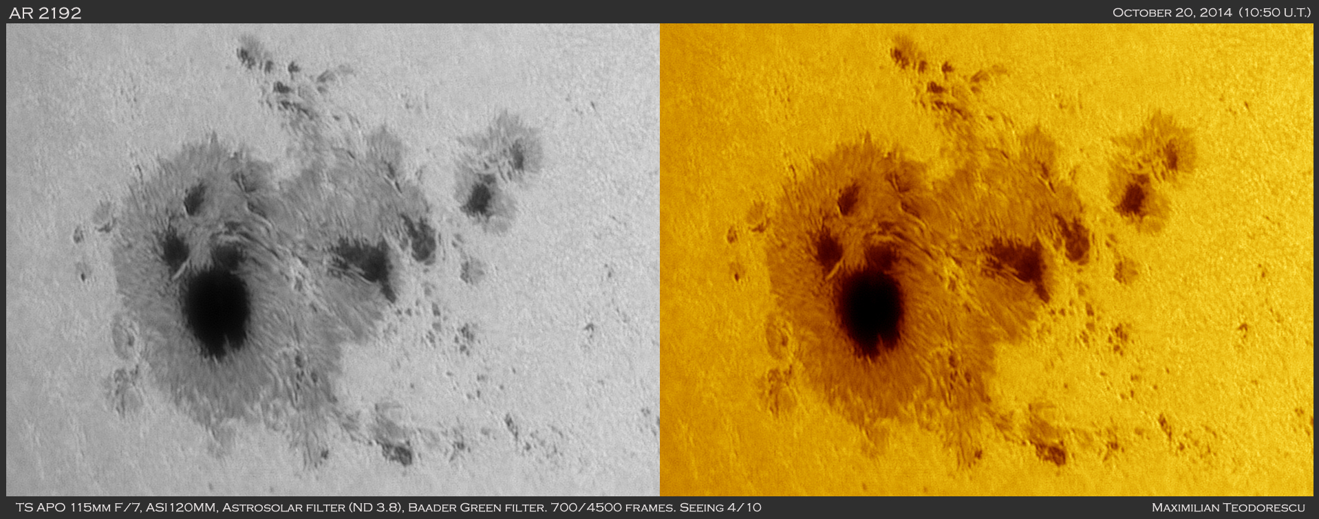 The following two versions of the same image were processed in both black-and-white and color to (perhaps) better show the aspect of this group near the solar limb. The equipment was the TS APO115mm F/7 Refractor working at F/18 and ASI120MM with Baader Green filter. The front full-aperture filter was Astrosolar with ND=3.8. Only the best 800 out of 8000 frames were selected, and this was because the seeing conditions were rather poor: 4/10.