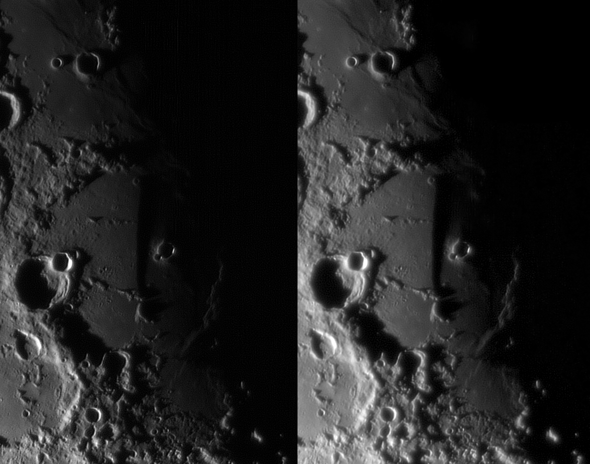 A comparison showing two different processing levels, one for the brighter areas, and the other showing more of the area next to the terminator, including the shadow of Rupes Recta: