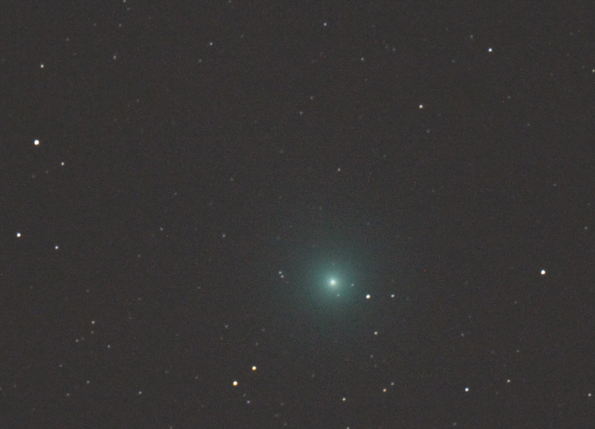 My first and only attempt at this “Winter Comet” was conducted in the night of December 24th, with the 4.5″ APO Refractor and Canon 550D at the focal plane. Fifty frames, each a 20 second exposure at ISO 3200, were combined into the following B-W image.