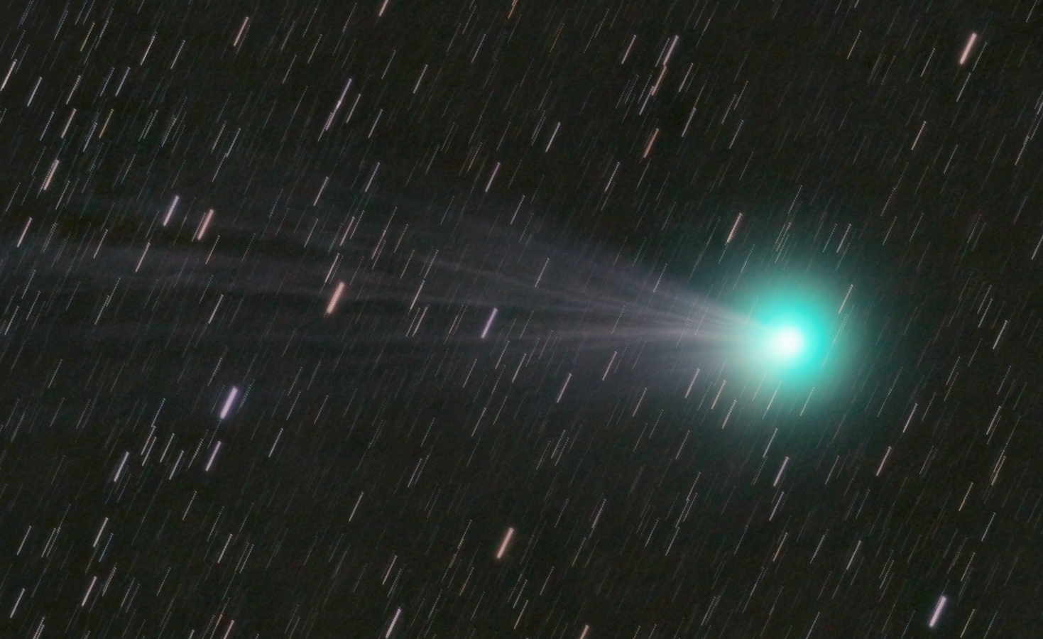 It is rather hard to catch both the background stars and tail detail in the same image, as the comet moves very fast. This is well visible in this 14x4minutes animation: