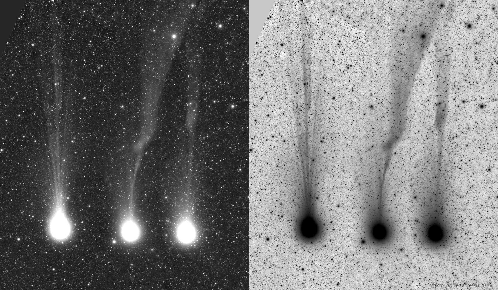 Since the 14th of February was the third day in a row in which I could image the comet, I’ve created the following grayscale and inverted mosaic showing both the comet’s position among the stars for those three days, and the fantastic evolution of the tail: