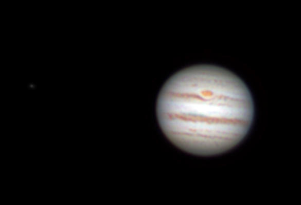 Our last celestial target of the session was planet Jupiter through a 127mm Maksutov telescope. It was this scope’s first light, and, of course, the seeing conditions were awful. The final image is an RGB one, with 800 frames acquired for each channel. The camera was a DMK 21 with Baader CCD RGB filters. The F/D ratio was around 25. The Great Red Spot is very easily discernable, as are some inner details.