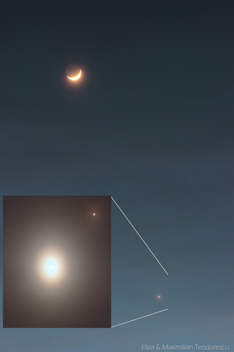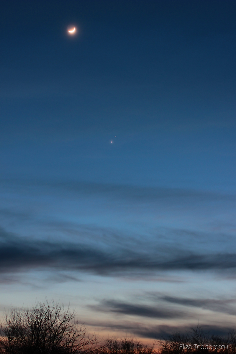 At first, we thought that the cirrus front rolling in would ruin our view of the conjunction, but eventually, the spaces between the clouds allowed for some photographs to be acquired.The following two shots, made by my wife, show the entire conjunction, with the Moon included.