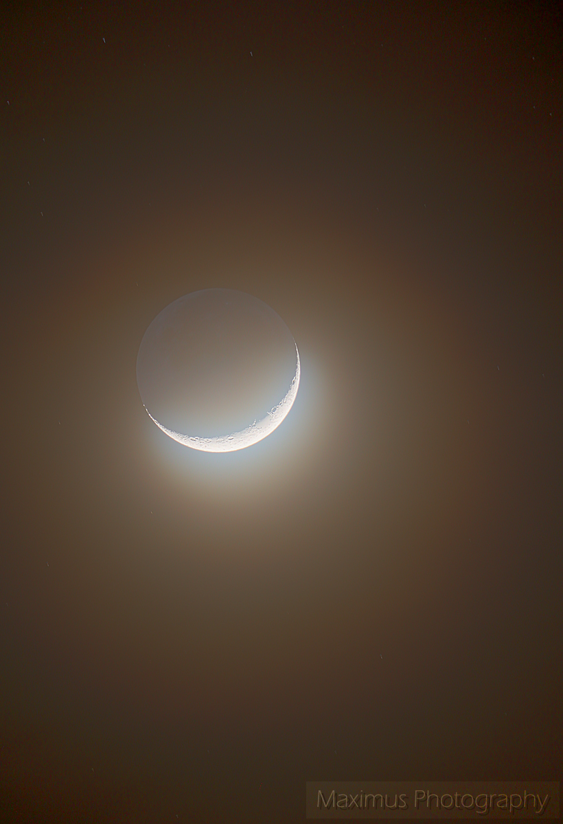 Of course, the Moon had also a sort of halo, which was rather hard to image with the 65mm refractor. 15 frames with exposures from 8 seconds to 1/320s were combined into the following HDR images, showing a blue aura around the lunar crescent: