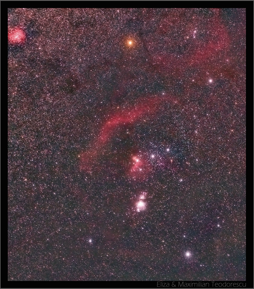 single frameOn the same night and the next, my wife acquired some frames with a 50mm lens, guided on a EQ3-2 mount. The subject was the constellation Orion, and she had to split the view into two regions, one covering the upper part of the constellation, while the second focused on the lower region. The second region was actually acquired on the first night, while the other the second night. This is why I had some serious problems with the processing, since in the first night the conditions were the same as for the images above. The second night the conditions were a bit better. The end result, after a lot of work: