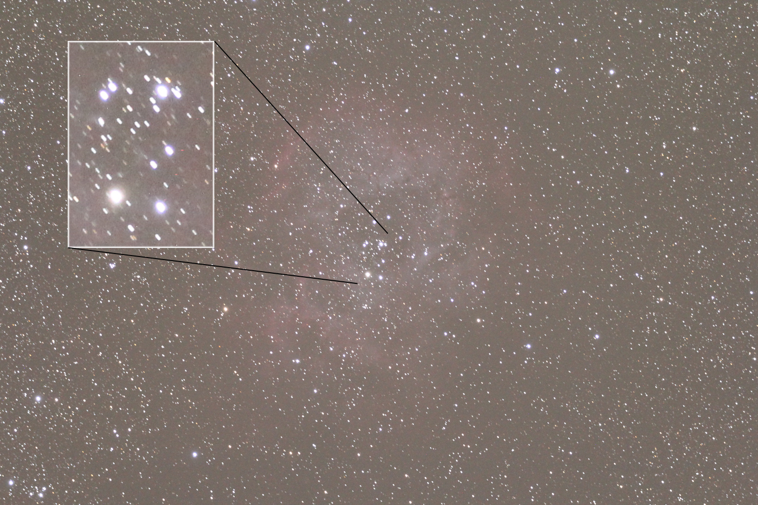 RozetaTo better understand the quality of the initial frames, I’ve also posted below a single resized-only frame, together with an inset showing the very poor tracking. The end result was made out from 11 such frames, acquired with the 65mm APO refractor at F/6.5 and Canon 550D at ISO 3200 and 4 minutes of exposure for each frame. The quality of the sky was also rather poor…