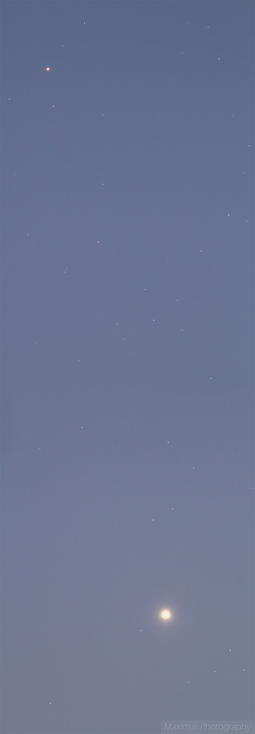 Next, on the 14th of February, and again from the same location as the above, I’ve imaged the Venus-Mars gathering shortly after sunset. Again I’ve used the 65mm refractor and since the separation of the two planets was still great, I had to make a two-panel mosaic: