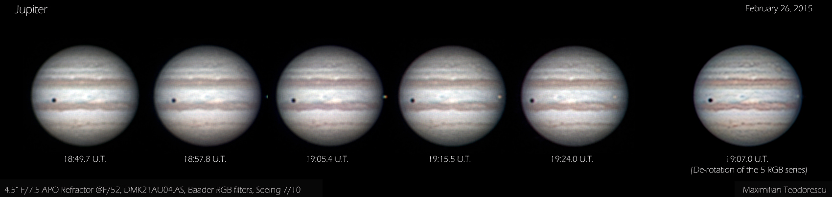 Again, the 115mm APO performed rather good, since the above sequence shows non-derotated images (only RGB channels were assembled in WinJupos with de-rotation). If I would have compared the de-rotated image obtained with the APO to the 200mm scope RGB shot, the difference wouldn’t be that great at all, again showing the quality of the scope under good seeing conditions.