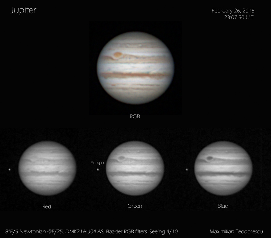 The following images were acquired on the evening/night of February 26, under good seeing conditions (6-7/10) most of the session. The F/D ratio was 52, so a bit too high, since Jupiter has a rather low surface brightness compared to the Moon. This is the reason I had to image at 15fps, and a 1/15s exposure time for each color channel. That meant a rather low frame number for each RGB sequence.