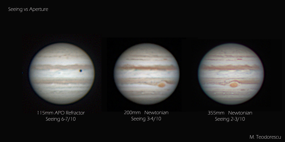 And since in the last two weeks I’ve imaged Jupiter with some of my instruments, I can now post a comparison between the apertures used and the seeing conditions:
