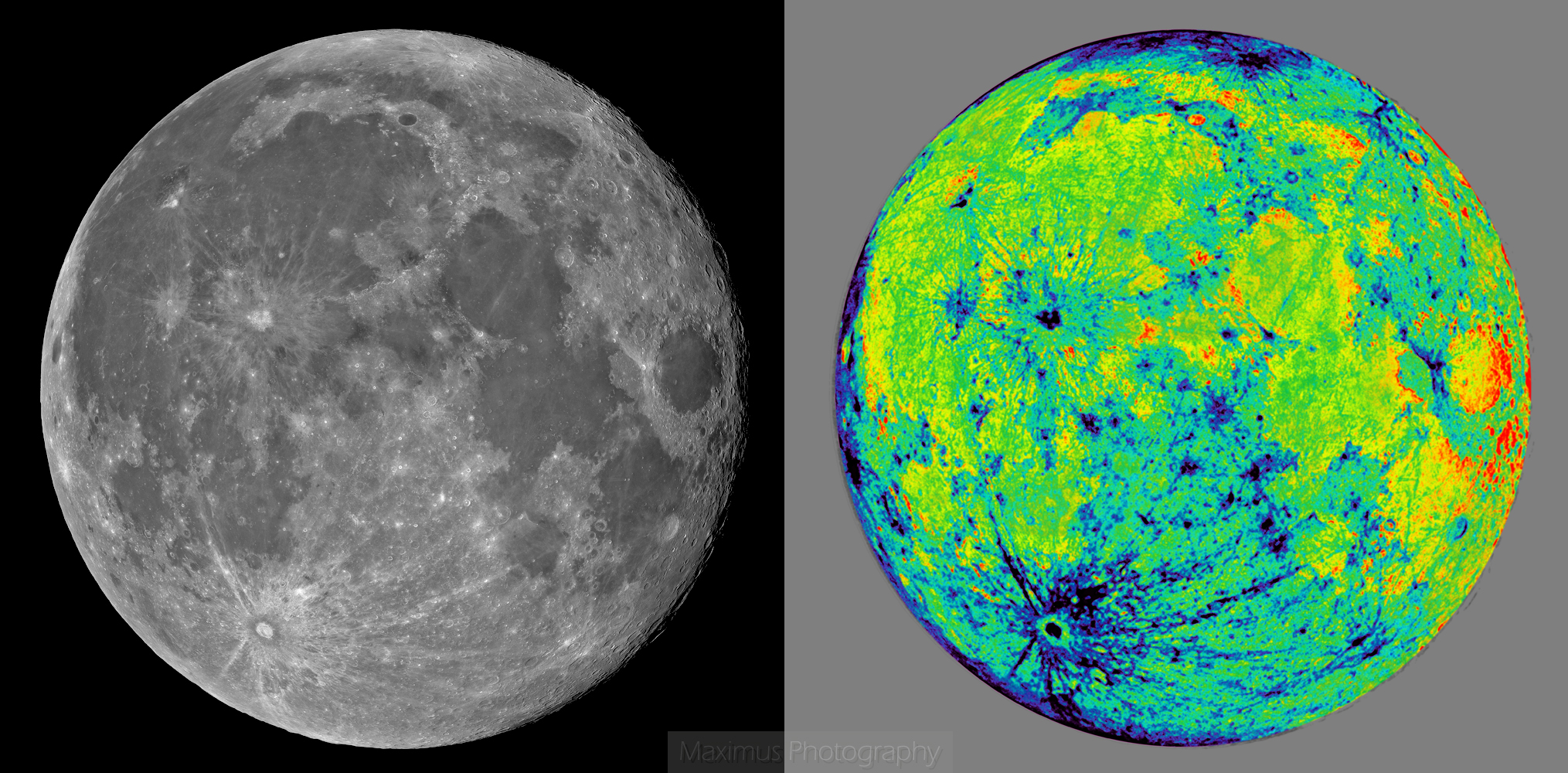 And now an interesting false-color processing showing the difference between the brightest and the darkest regions on the Earth-oriented face of the Moon. Black is for the brightest regions, dark blue for lesser bright areas, yellow-green for the maria, and red for the darker regions. Due to the illumination (<100%) the regions at the eastern terminator (right in the image) present some red areas, but this is due in part to the unevenly illuminated surface. This means that the most eastern regions that show red might not be at that level of darkness.