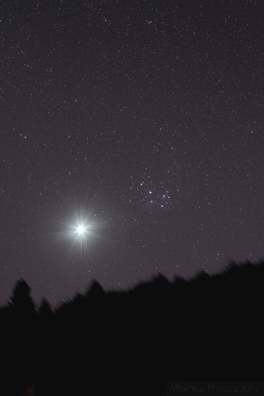 Venus is passing by the Pleiades (Messier 45) above the western horizon, while Jupiter, high in the sky, is also passing by another open star cluster, M44.
