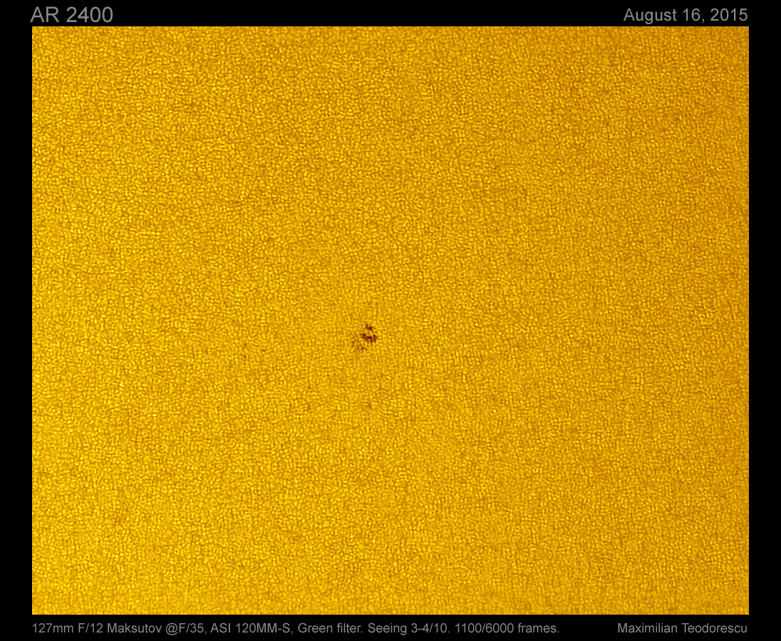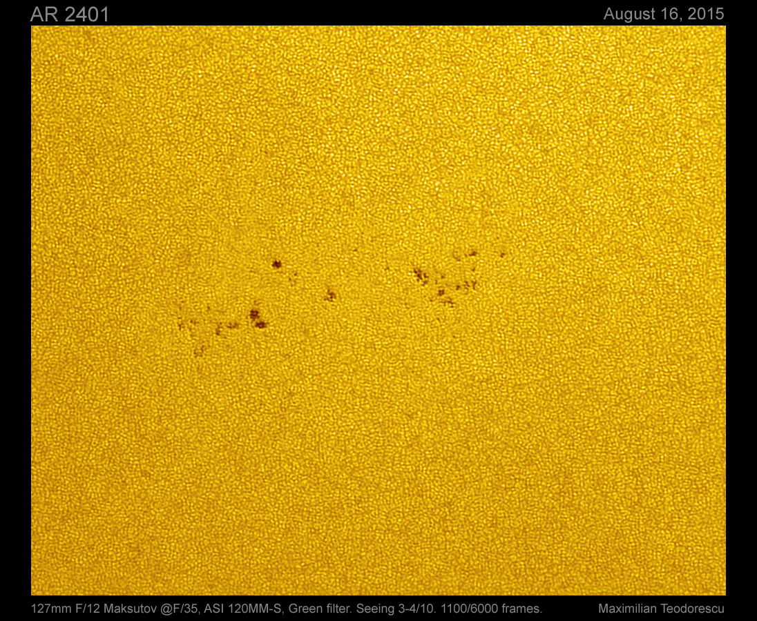 After finishing the Venus session, I’ve pointed the telescope towards the Sun (with a proper solar filter placed at the front) and imaged the two very small and apparently uninteresting sunspot groups. The granulation is discernible, but the seeing conditions, amplification factor and scope diameter didn’t allow for a clear view of the Sun’s surface.