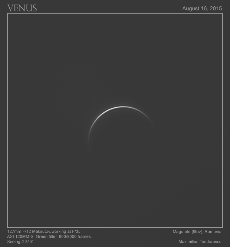 Just a few tens of hours ago, planet Venus was at inferior conjunction, meaning that the planet was between the Sun and the Earth. This means that the angular diameter of Venus was at it’s maximum, near 1 arc-minute, or around 1/30 from the apparent diameter of the Sun or Moon in our skies. This is usually very good for astro-photographers since the bigger the size of the object, the smaller details can be obtained onto it’s surface. The problem with Venus (and Mercury also) is that being closer to the Sun compared to Earth, at it’s largest apparent size the planet is only visible in the daytime. This also means that finding the planet is not as easy as looking for it at sunset/sunrise with your naked eyes and pointing the scope in that direction; in daytime you have to know the position of the planet in relation to the Sun (or if you have a GPS scope just press the GOTO function) and hope you don’t point it directly to our star…which will damage one of the sensors (either your CCD/CMOS camera, or…the eye!!!).