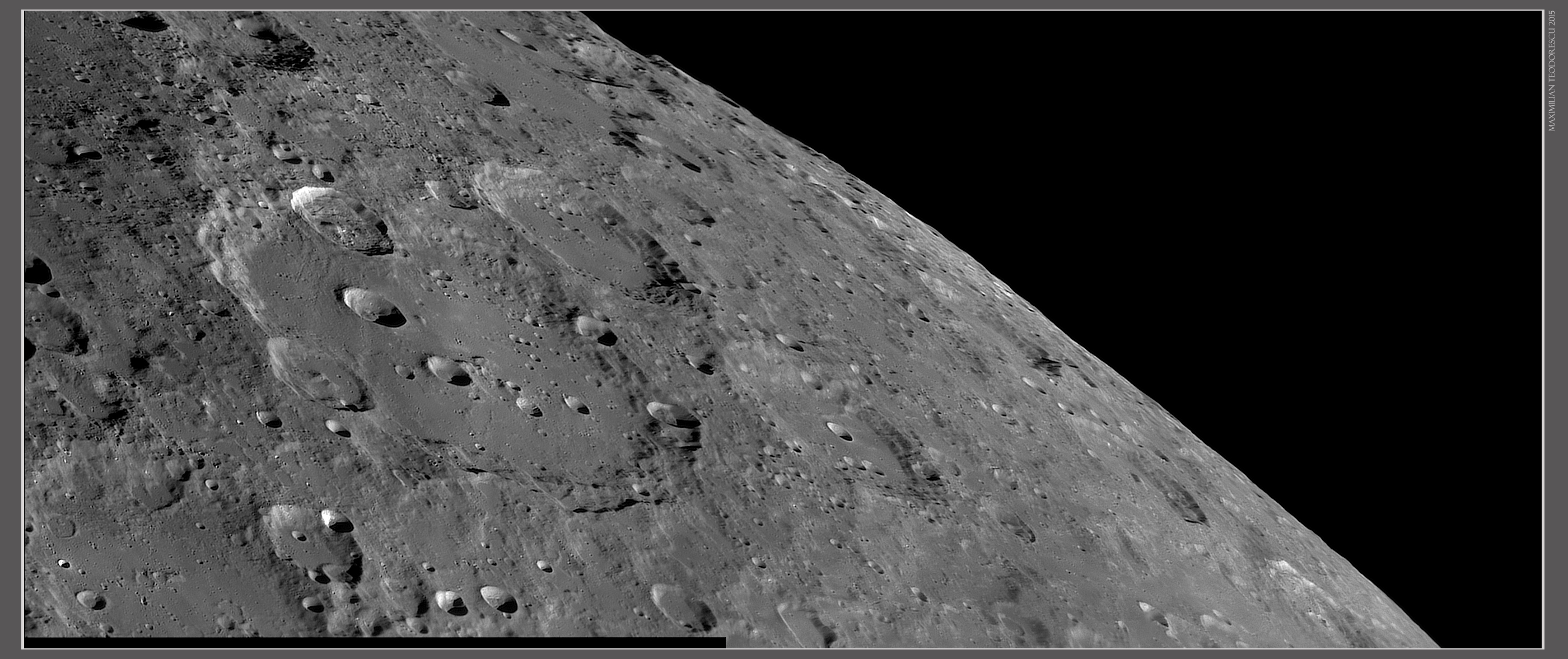 Another mosaic, this time a two-frame shot, shows the well-known large crater Clavius and the lunar limb in an orbital flight-like view.