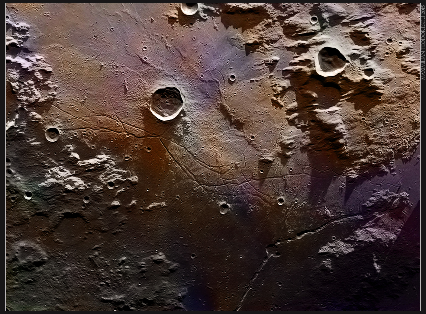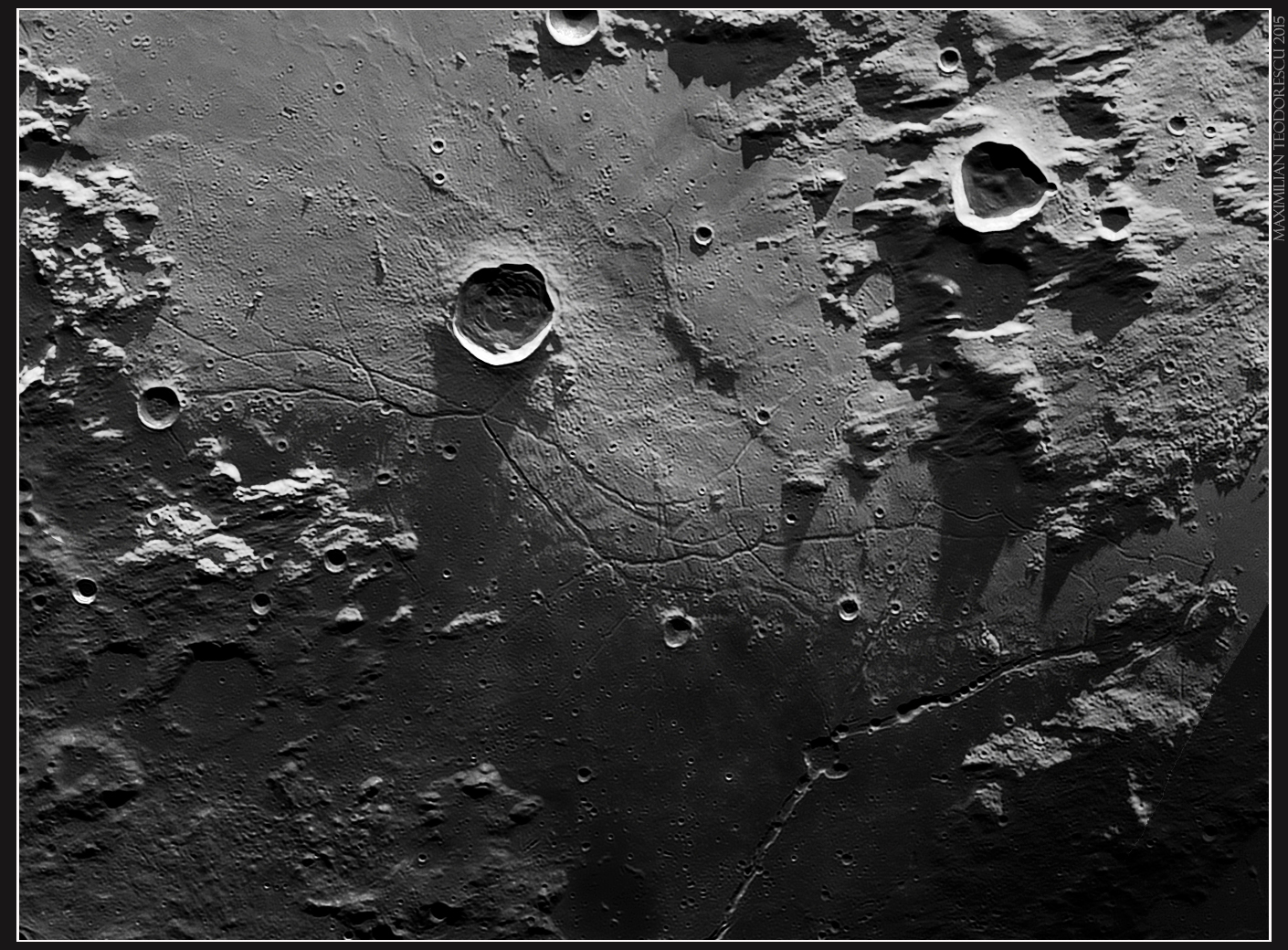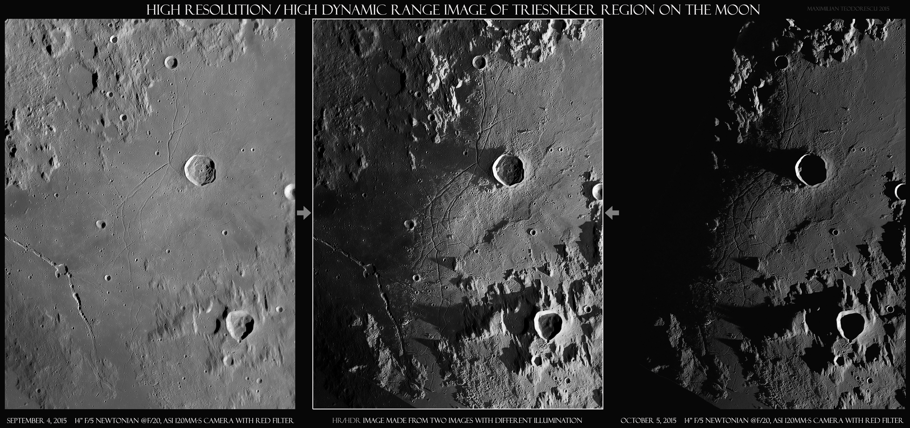 The image above is created from two shots acquired in the mornings of September 4th and October 5th, 2015. In both occasions, the seeing was very good. The illumination was quite different: the image from September has the Sun at a higher altitude compared with the very low altitude from the October image. So, having these two different conditions, the combined “HDR” shot presents both the finer details as seen from above, and the elevation information due to the low angle illumination.