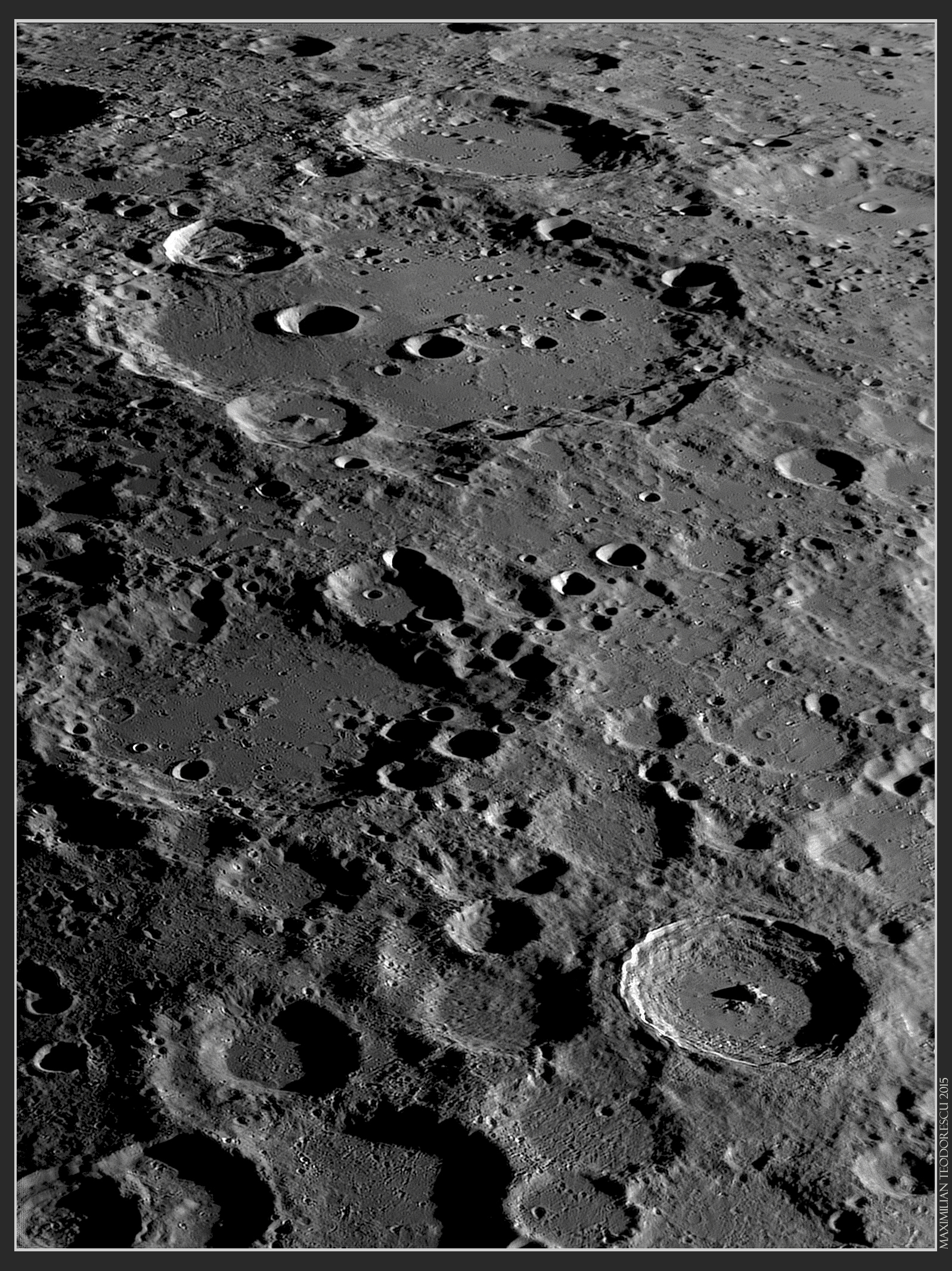 A large mosaic (six frames) presenting a well known trio of craters (Arzachel, Alphonsus and Ptolemaeus, from top to just below of center) and the less imaged large craters Albategnius (in shadows with the central peak just illuminated) and Hipparchus (below Albategnius) on the lunar terminator: