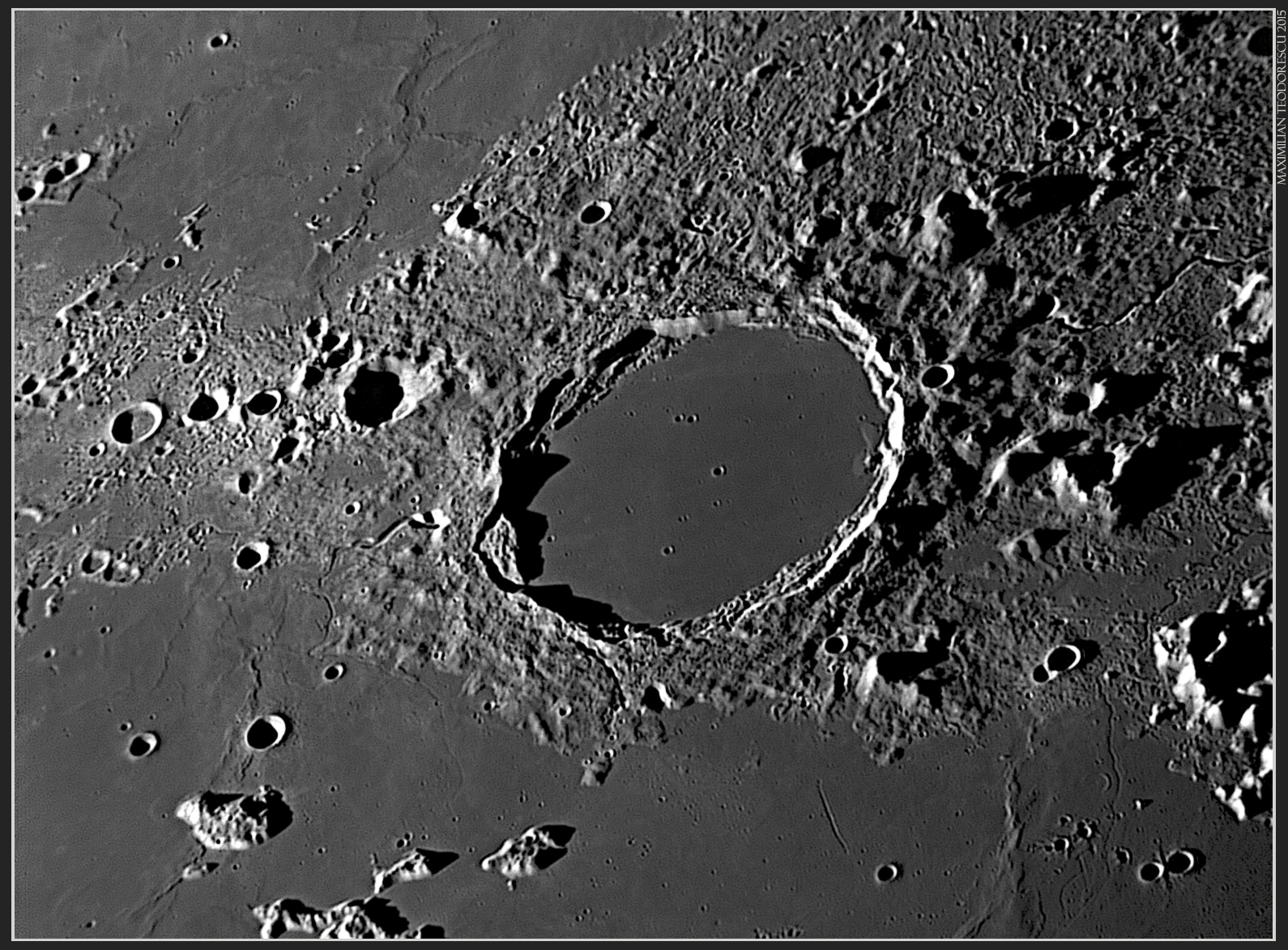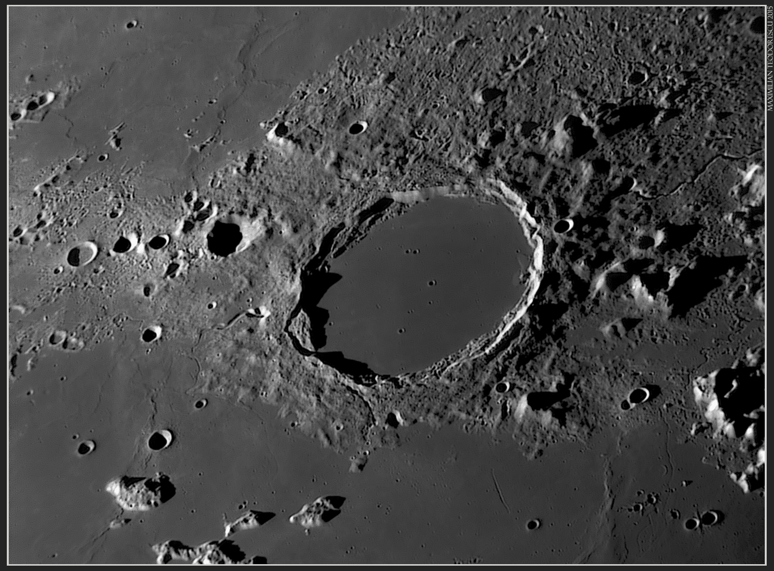Rima Triesneker with crater Triesneker (center, with the caldera in darkness) and the double crater Murchinson/Pallas (to the right of Triesneker). Lots of interesting details are visible due to the low-Sun illumination: