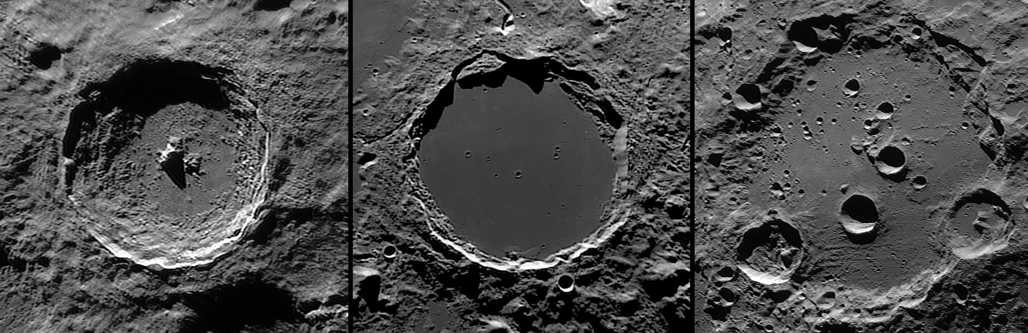 And since I usually try to get more from my images, a “rectified vertical perspective” view of some craters performed in order to grasp the true shape of these craters. From left to right: Tycho, Plato and Clavius: