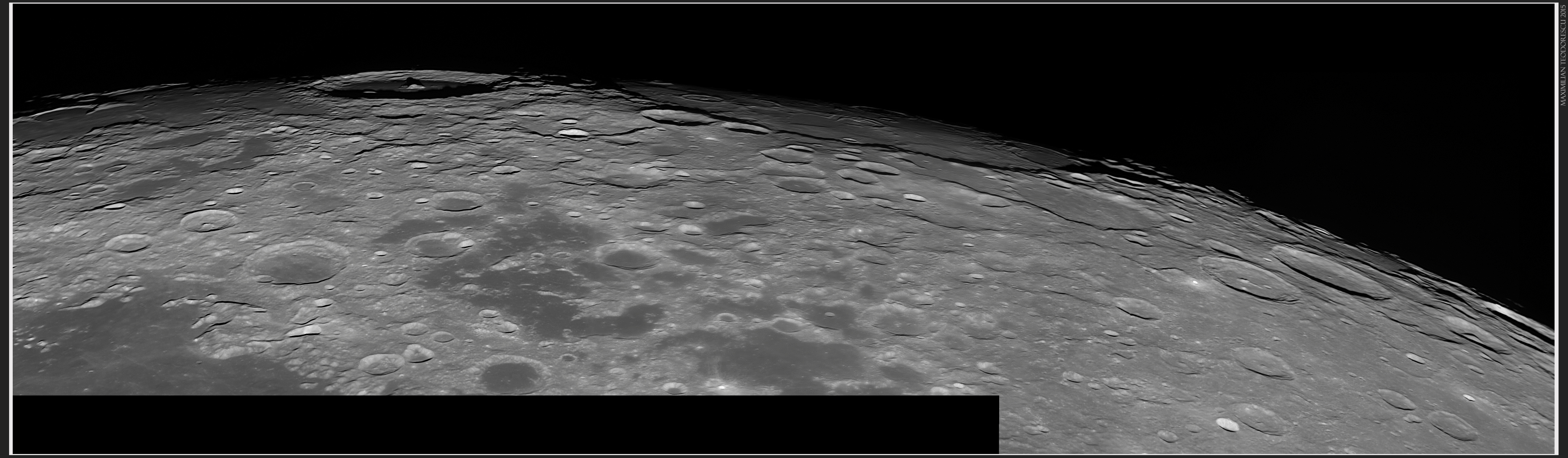 The first image is a four-panel mosaic, showing the South-Eastern limb, with crater Neper (left) and Mare Smythii dominating the view on the terminator. This mosaic was acquired at F/20 and in red light using a Baader Red filter.