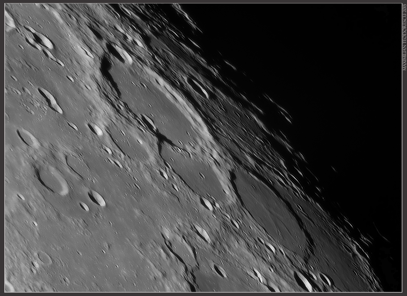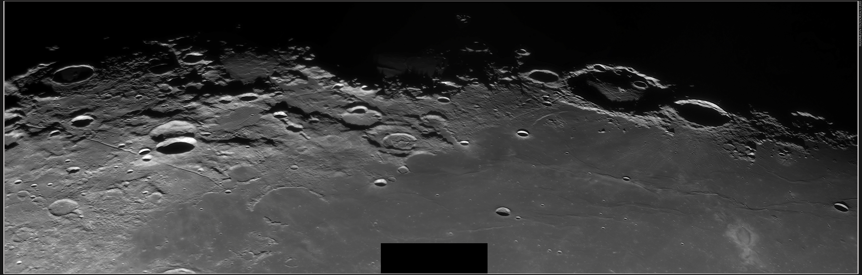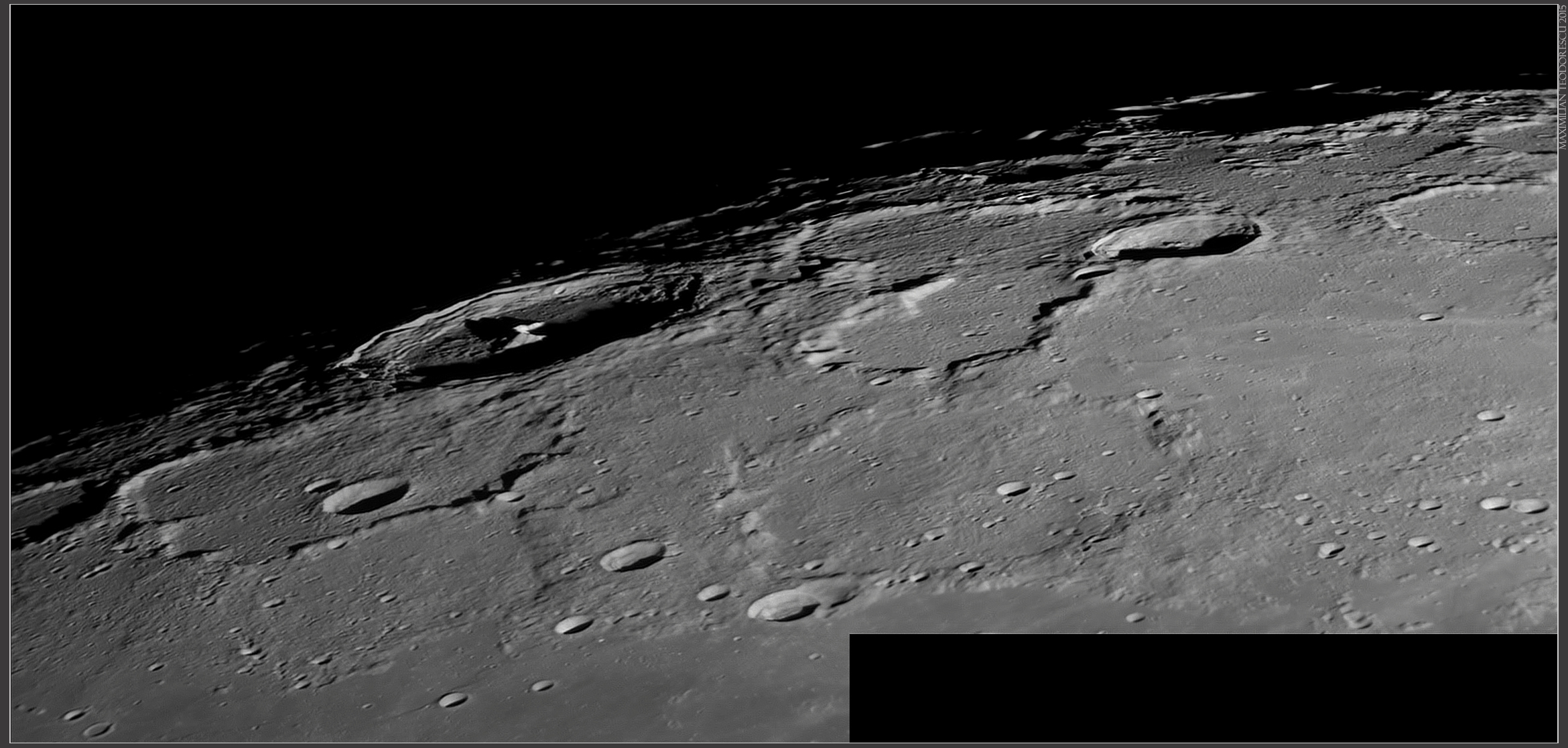 And the last formation imaged, Vallis Schroteri with crater Aristarchus (the brightest in the image) well depicted under this illumination. Notice the smaller rille inside Vallis Schroteri, and the many other smaller rilles towards north-east (lower right) from Aristarchus. Notice also the many terraces inside Aristarchus.