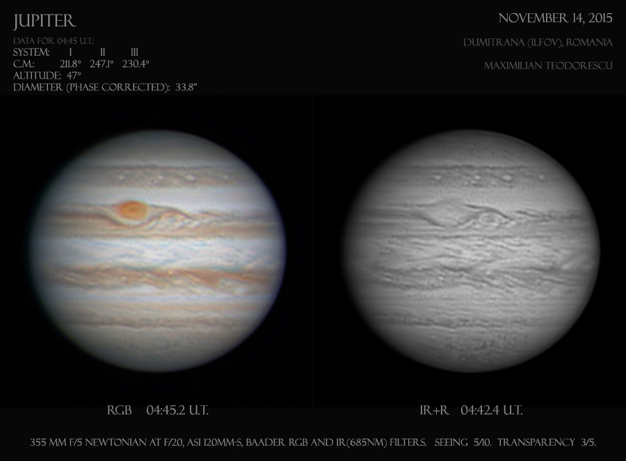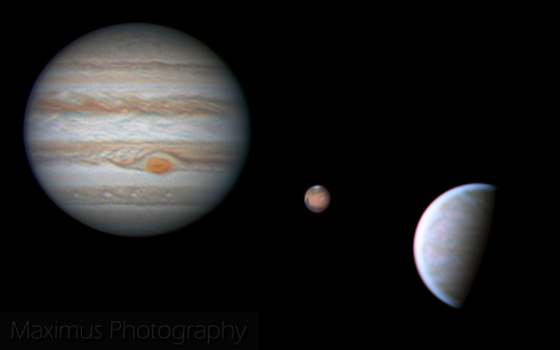 The next planet was the most difficult to image, due to its very small apparent diameter, of only 4.4 arc seconds. This is the smallest diameter at which I’ve ever imaged Mars. Surprisingly, a lot of details are visible like the white polar cap and the dark-blue Syrtis Major formation.