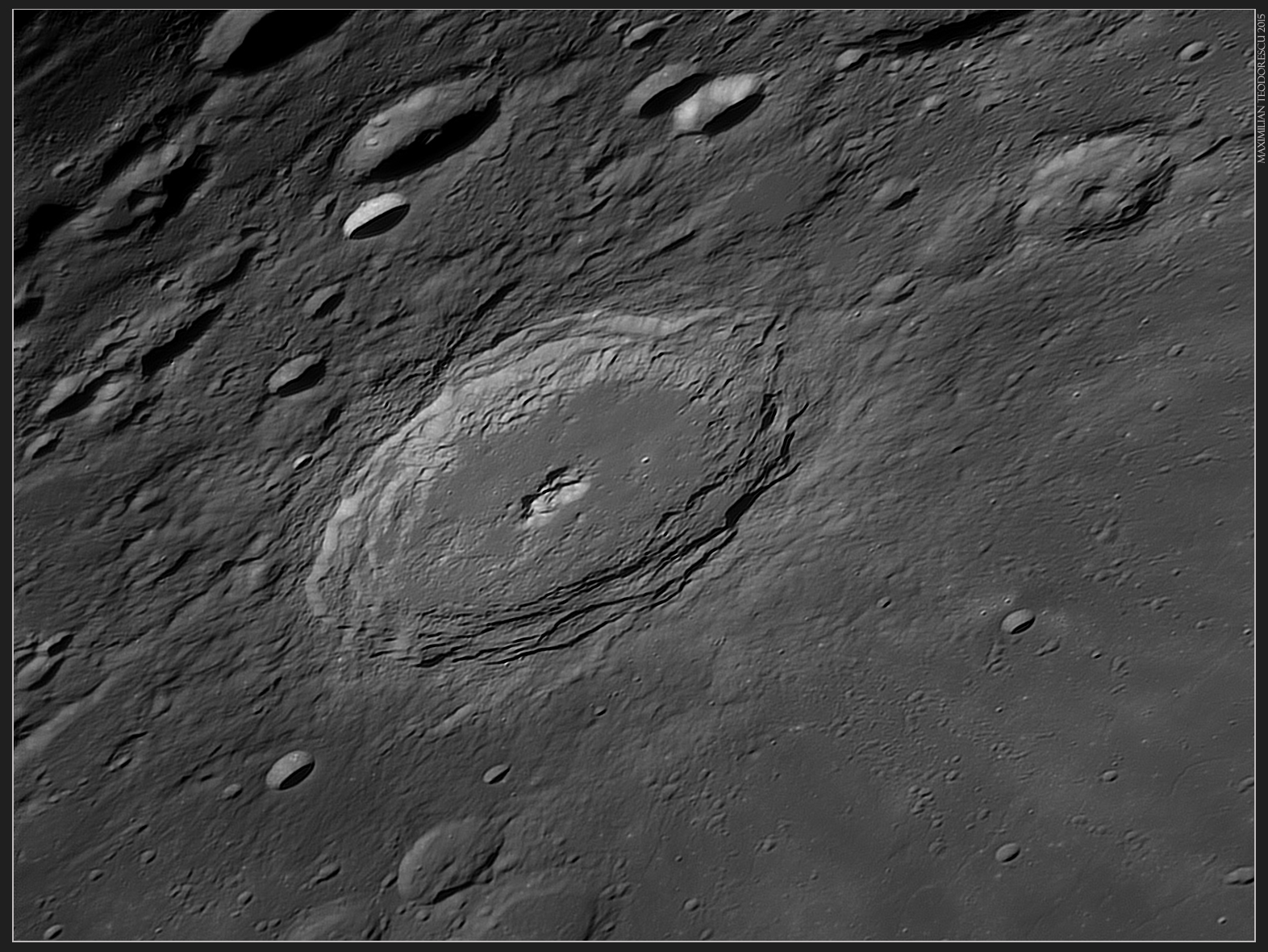 Another recognizable crater, Langrenus (133 km), with its central mountain and sharp rim: