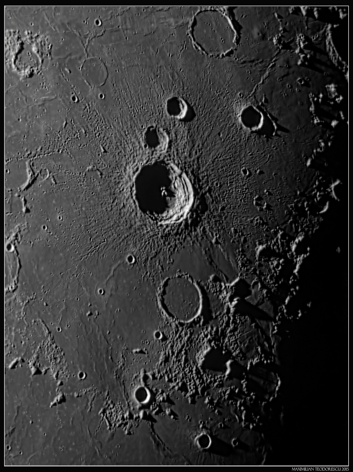 First image shows the crater Copernicus near the terminator and Eratosthenes nearby. Lots of secondaries and some buried craters are visible between these two large ones.
