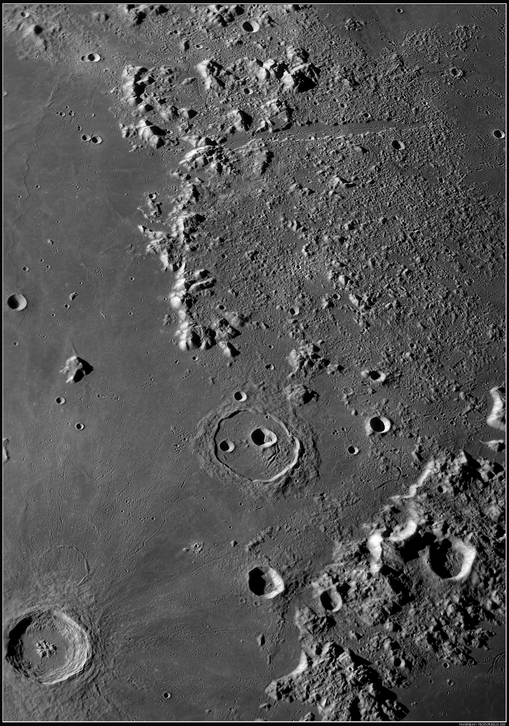The first shot presents the area of the Hyginus, Triesnaker and Ariadaeus Rimae. The smallest detectable craters have diameters in the range of 450-500 meters. The smallest rimae visible is the one in Boscovich, which I’ve presented in an earlier post; it is visible almost in the center of the image, crossing the flat dark floor of the crater.