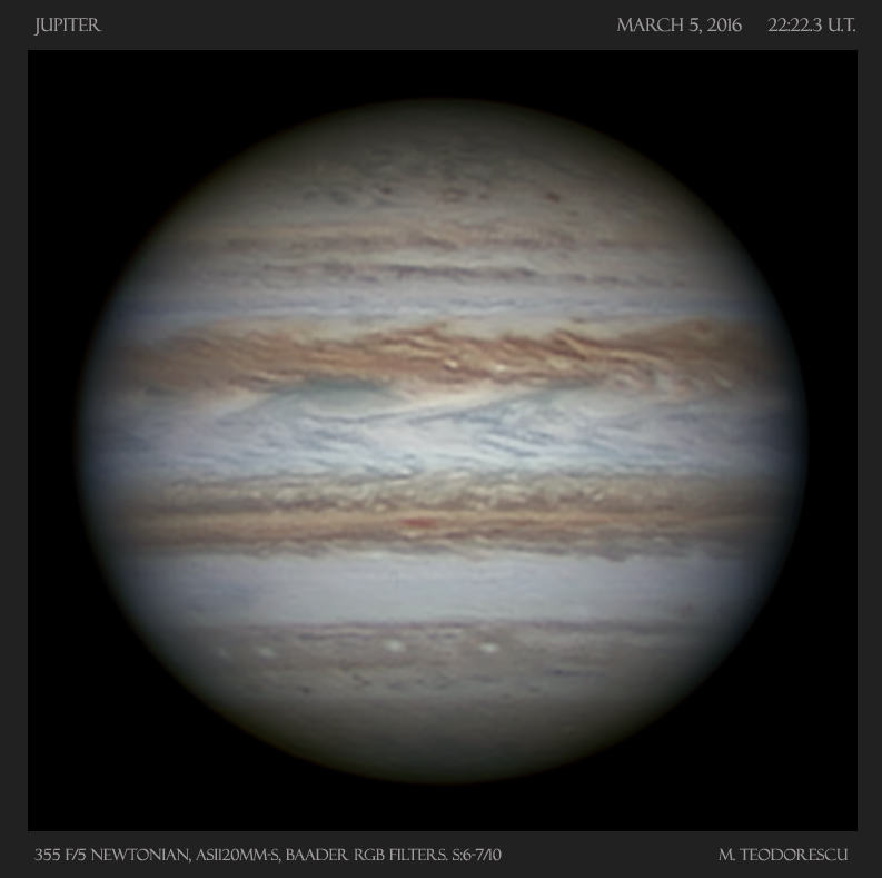 But I did get a chance to image the planet a few days ago, when the cirrus clouds allowed for some rather steady skies, which is a bit unusual in February for my location. When I say “steady”it does not mean that the seeing was excellent, but for a few brief seconds I had some very nice views on the laptop screen with the giant of our Solar System. The seeing was around 6 to 7/10. Not bad, but Jupiter requires some very steady conditions in order to image the very small and intricate details in its atmosphere. Plus, another problem: the very humid location allowed for some fog to form, and also a lot of dew on the secondary mirror of the scope; this forced me to go quite high with the gain setting, and thus adding a lot of noise to the images…