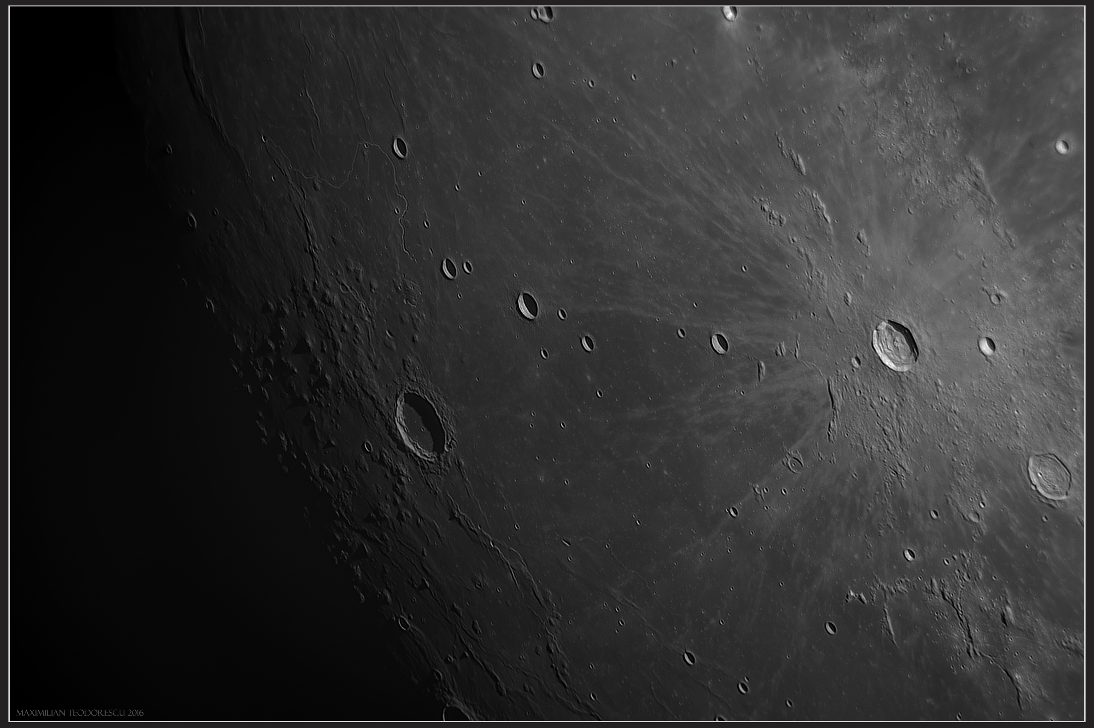 The next shot was acquired with the 14 inch F/5 Newtonian at F/20 and the ASI 174MM with Red filter, in 7/10 seeing conditions. It presents the very interesting area around crater Marius (the flat floor crater in the left hand side) with its many domes. Also, Kepler can be seen in the right hand side, with its ray system across the field. Some rimae are also observable.