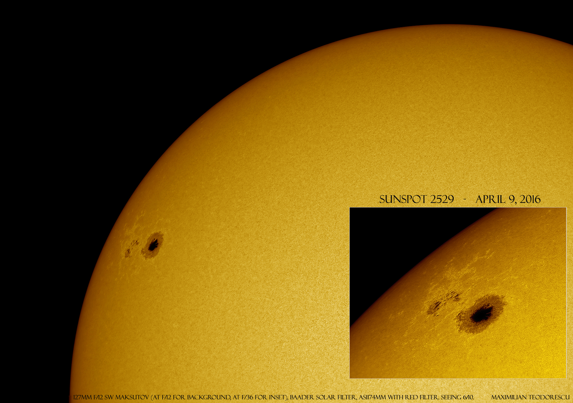 While on a short trip into the woods, I had some time to look and image this great sunspot through a small 127mm Maksutov telescope and the ASI 174mm camera. Not the best seeing, but the large sunspot is a nice sight even on poor conditions. All technical data on image.